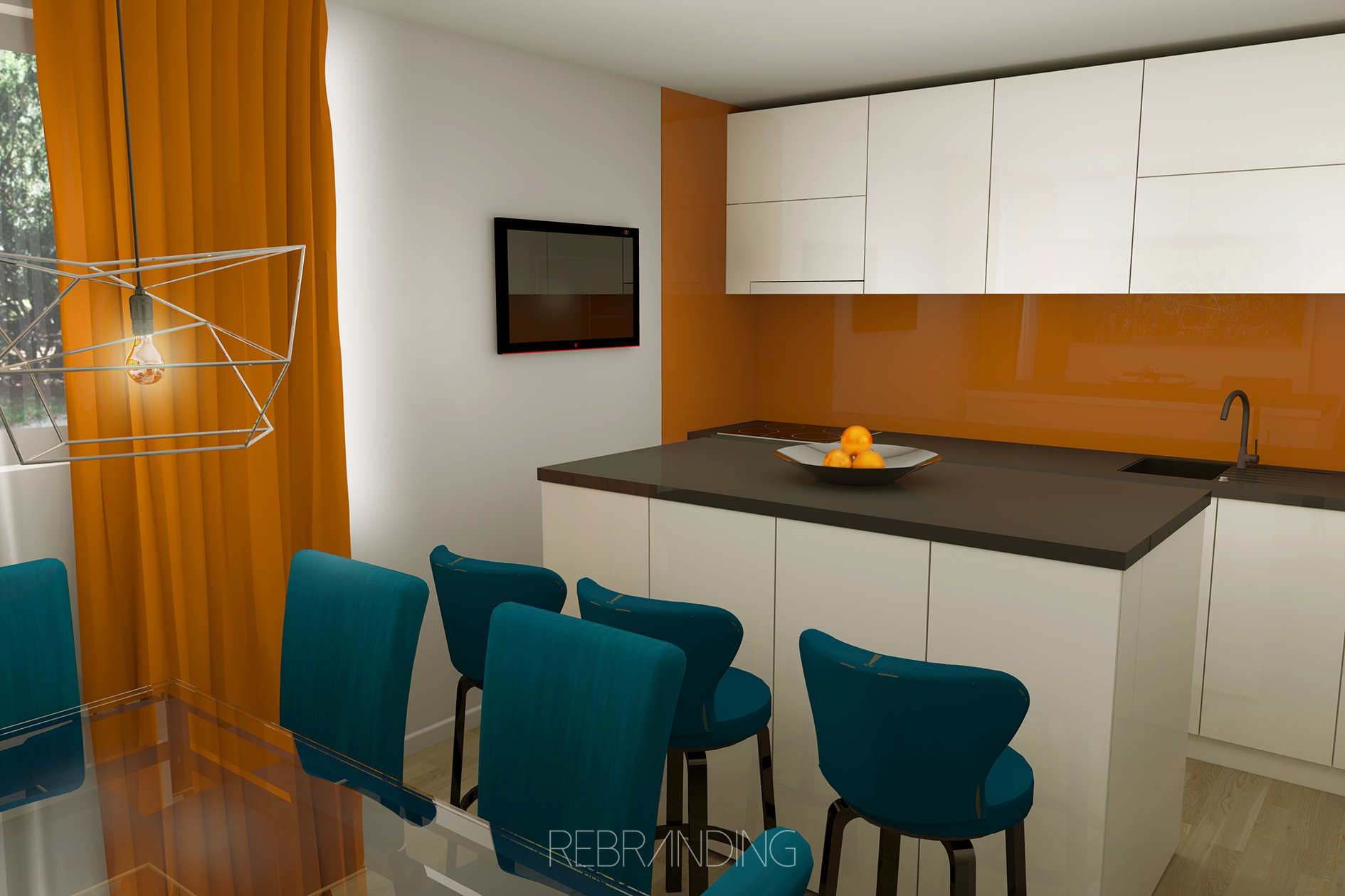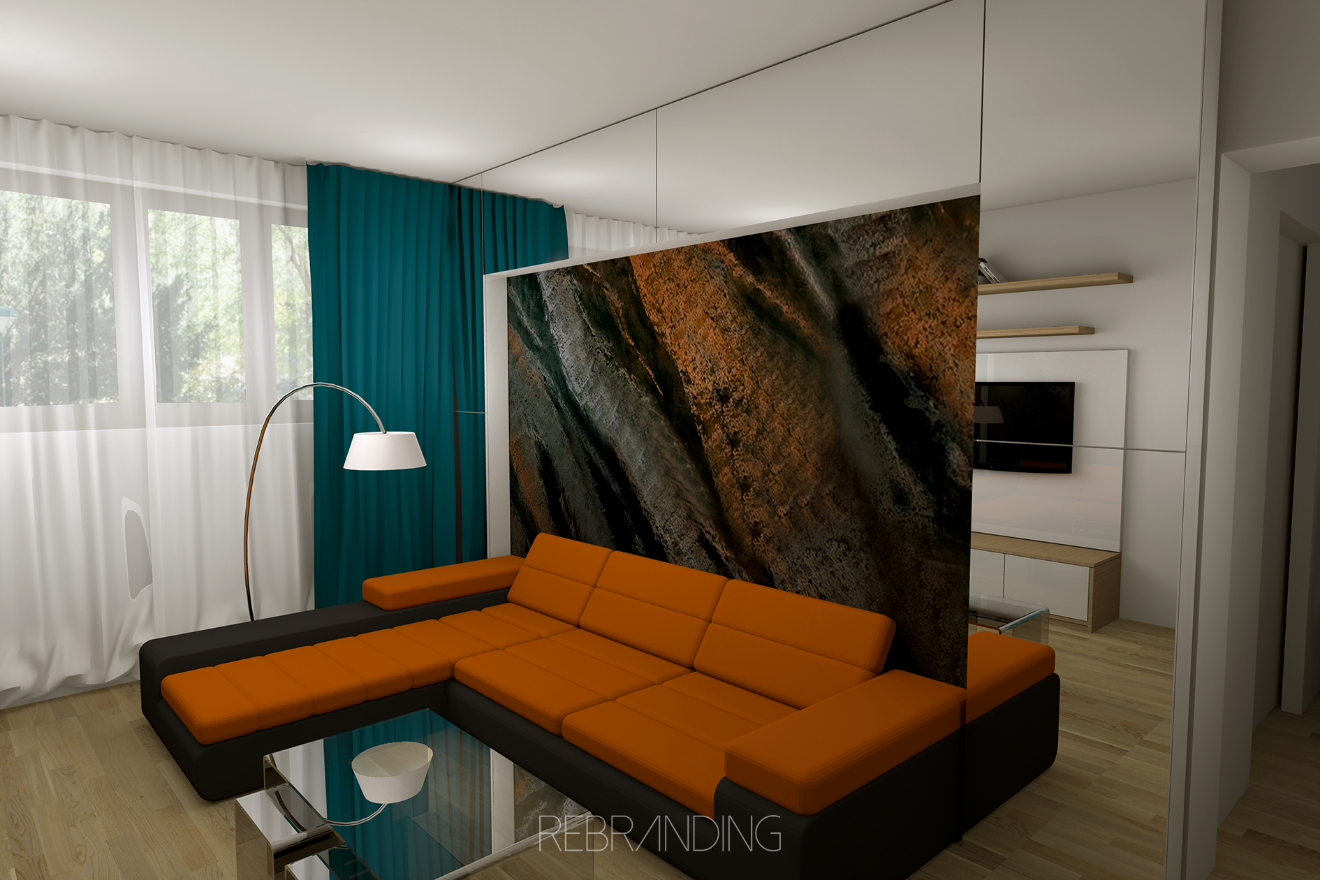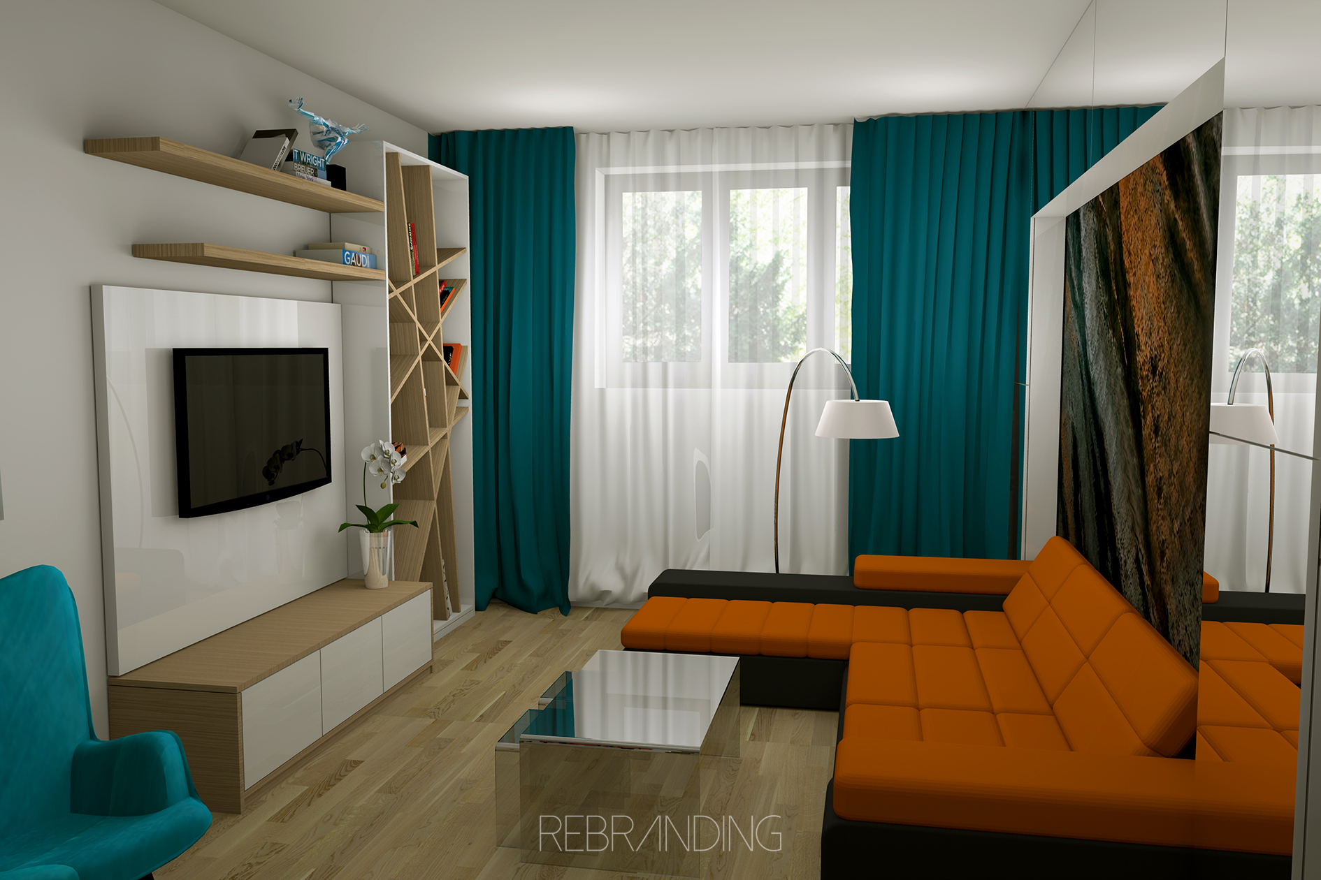 Reamenajarea acestui apartament, a plecat de la decopertarea intregilor pereti si a sapei si schimbarea instalatiilor electrice-sanitare. S-au facut imbunatatiri asupra zonelor afectate de trecerea anilor si s-au retencuit peretii si plafoanele. Fiind amplasat intr-o vila din anii ’50, apartamentul beneficia de sitem de incalzire cu sobe. Acestea au fost demolate, insa placile de teracota aflate in stare buna, s-au pastrat pentru constructia semineului din zona de living. Conceptul proiectului de design, s-a bazat pe culori tari, acesta fiind si dorinta clientilor. S-a optat pentru culoarea de accent „oranj” pentru zona de zi a acestui apartament, aceasta culoare gasindu-se in combinatie cu negru pe peretele din spatele canapelei din living, dar si in materiale textile precum canapeaua si draperia.