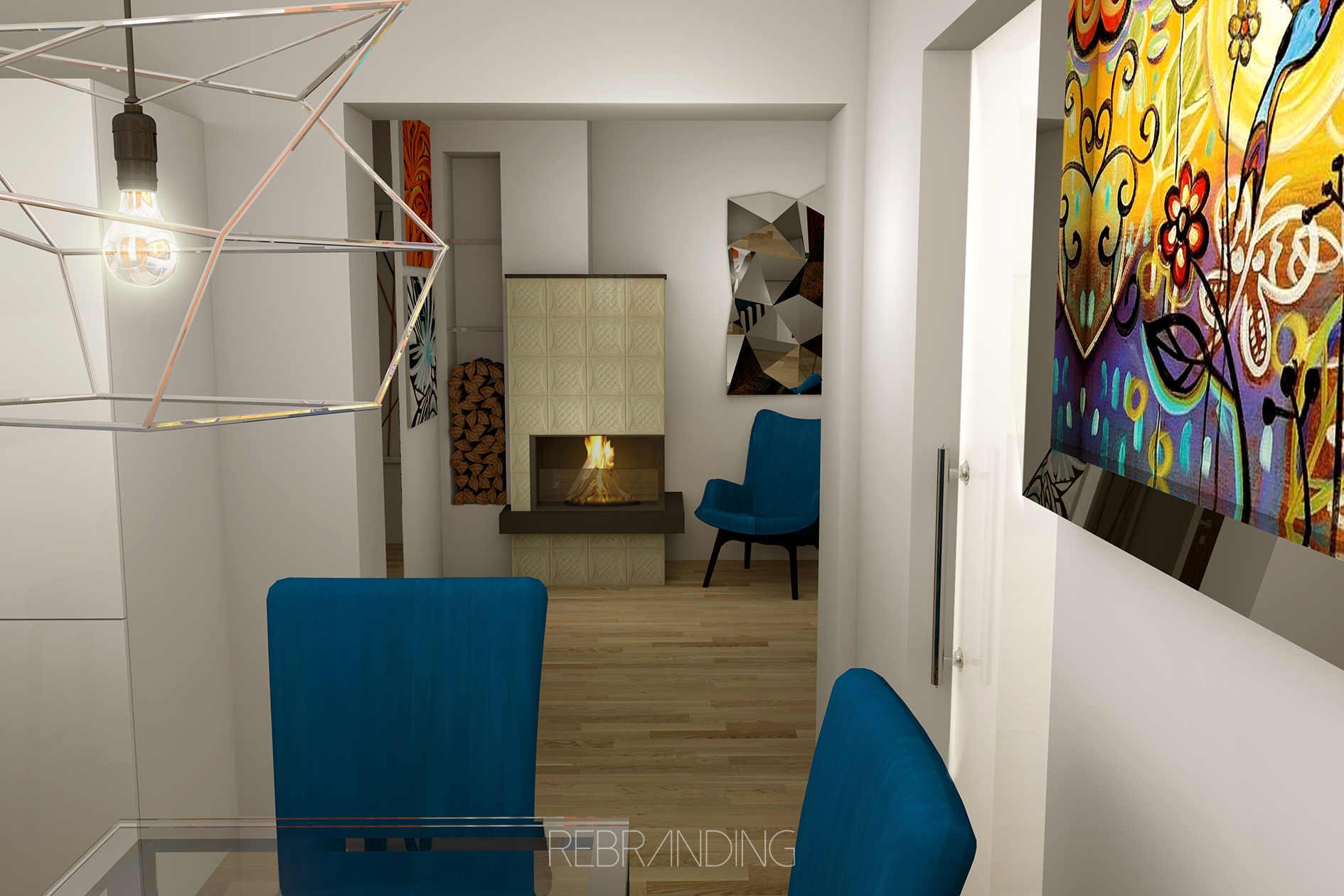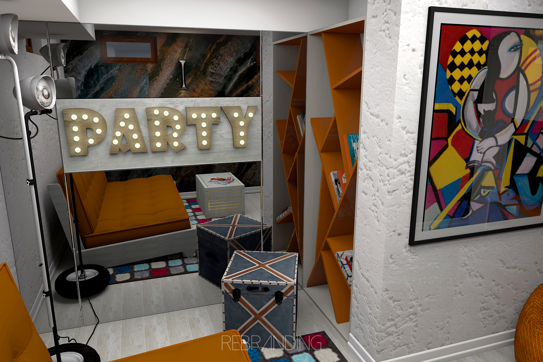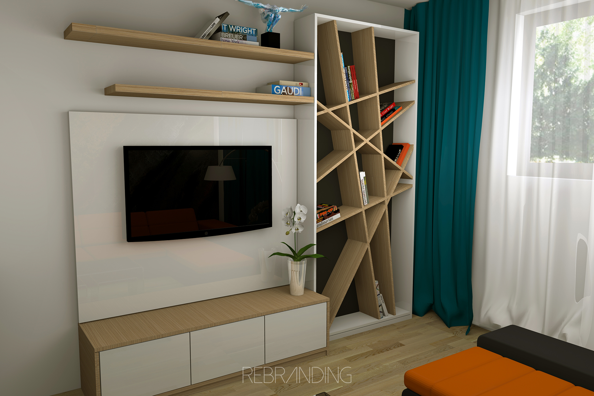 Reamenajarea acestui apartament, a plecat de la decopertarea intregilor pereti si a sapei si schimbarea instalatiilor electrice-sanitare. S-au facut imbunatatiri asupra zonelor afectate de trecerea anilor si s-au retencuit peretii si plafoanele. Fiind amplasat intr-o vila din anii ’50, apartamentul beneficia de sitem de incalzire cu sobe. Acestea au fost demolate, insa placile de teracota aflate in stare buna, s-au pastrat pentru constructia semineului din zona de living. Conceptul proiectului de design, s-a bazat pe culori tari, acesta fiind si dorinta clientilor. S-a optat pentru culoarea de accent „oranj” pentru zona de zi a acestui apartament, aceasta culoare gasindu-se in combinatie cu negru pe peretele din spatele canapelei din living, dar si in materiale textile precum canapeaua si draperia.